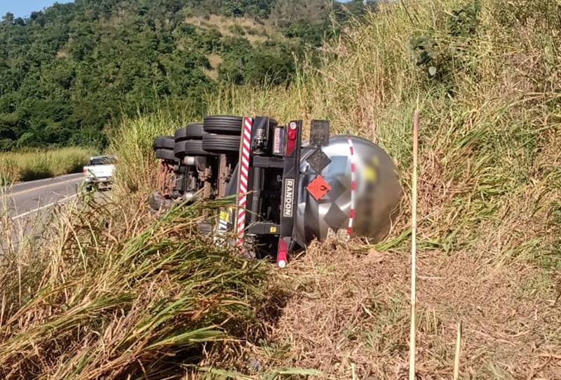 Uma carreta que transportava produto químico tombou neste sábado, 29 de maio, na BR-116, em Leopoldina. O veículo seguia da Bahia sentido Santa Catarina.