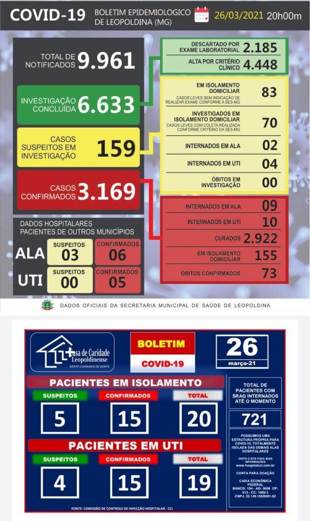 O município de Leopoldina registrou mais um óbito pelo novo coronavírus nesta sexta-feira, 26 de março. A informação foi divulgada através do boletim diário da Secretaria Municipal de Saúde de Leopoldina.