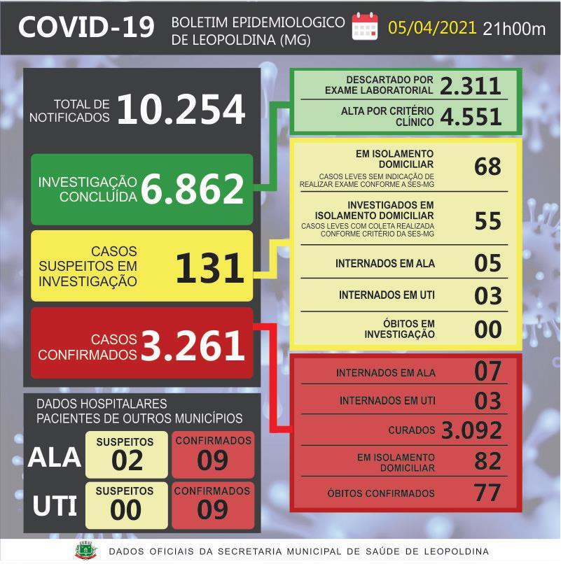 A Secretaria Municipal de Saúde de Leopoldina registrou mais uma morte causada pela Covid-19. Conforme o boletim desta segunda-feira, 5 de abril, o óbito trata-se de uma mulher com faixa etária de 80 a 89 anos. Com isso, o número de mortes pela Covid-19 sobe para 77 no município desde o início da pandemia.