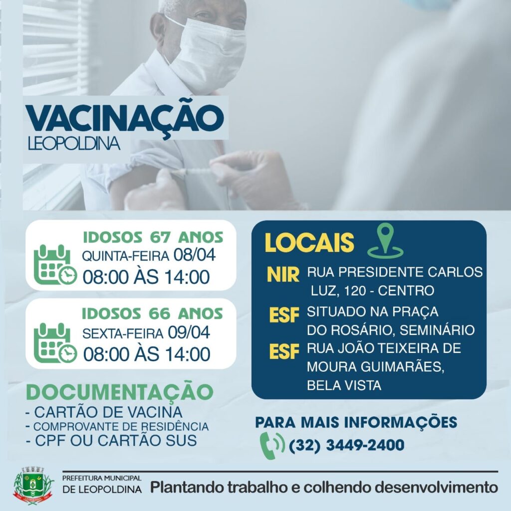 Para garantir mais segurança, a imunização também será realizada no esquema drive-thru (vacinação dentro do carro). A prefeitura de Leopoldina ressalta que é importante levar o Cartão do SUS ou CPF, comprovante de residência e o cartão de vacinação.