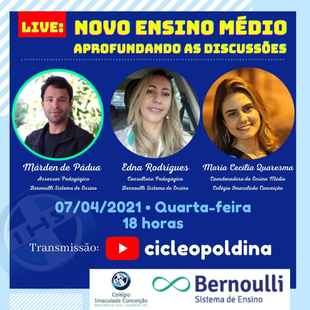 Conceição Zambrano acrescentou que a Live contará com a participação de Márden de Pádua e Edna Rodrigues – Assessores Pedagógicos do Bernoulli Sistema de Ensino e Maria Cecília Quaresma, Coordenadora do Ensino Médio do Colégio Imaculada Conceição.