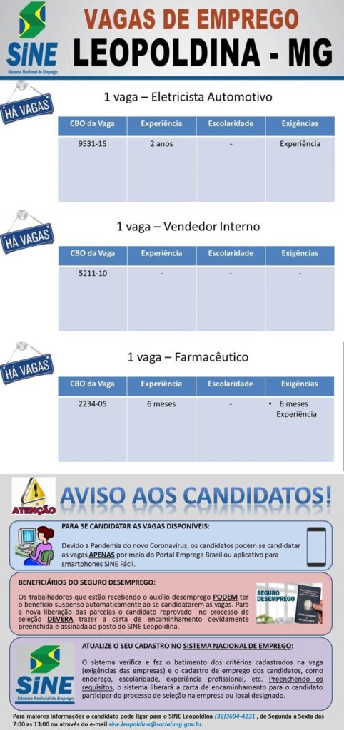 O Sistema Nacional de Emprego (Sine) de Leopoldina divulgou, nesta terça e quarta-feira, 7 de abril, três novas vagas de emprego para eletricista automotivo, vendedor interno e farmacêutico.