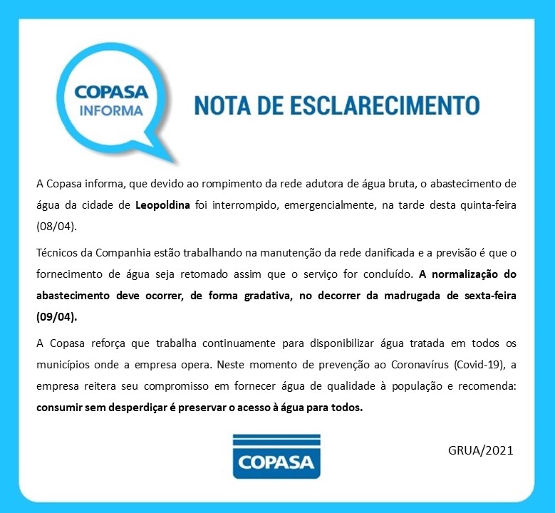 O rompimento da principal adutora da Copasa em Leopoldina pode prejudicar o abastecimento de água na cidade nesta quinta-feira (8).