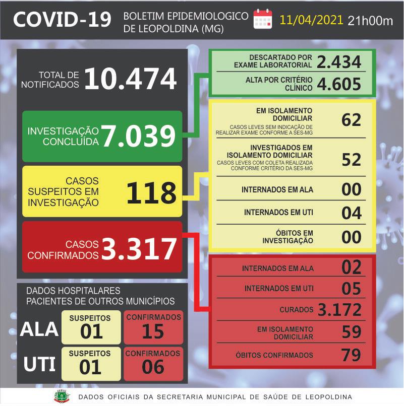 A Secretaria Municipal de Saúde registrou um novo óbito neste domingo, 11 de abril, em Leopoldina.