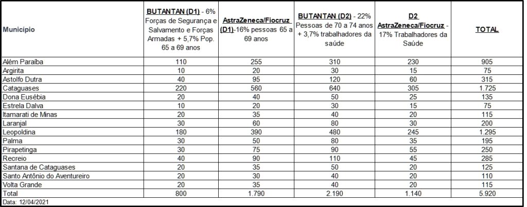 A Gerência Regional de Saúde (GRS) de Leopoldina recebeu nesta segunda-feira, 12 de abril, mais 5.920 doses da vacina contra covid-19.