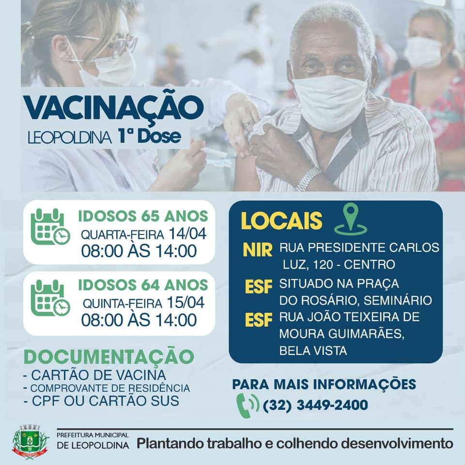 De acordo com a prefeitura de Leopoldina, na quarta-feira a imunização será para as pessoas com 65 anos e na quinta-feira, dia 15, será a vez de pessoas com 64 anos receberem a dose.