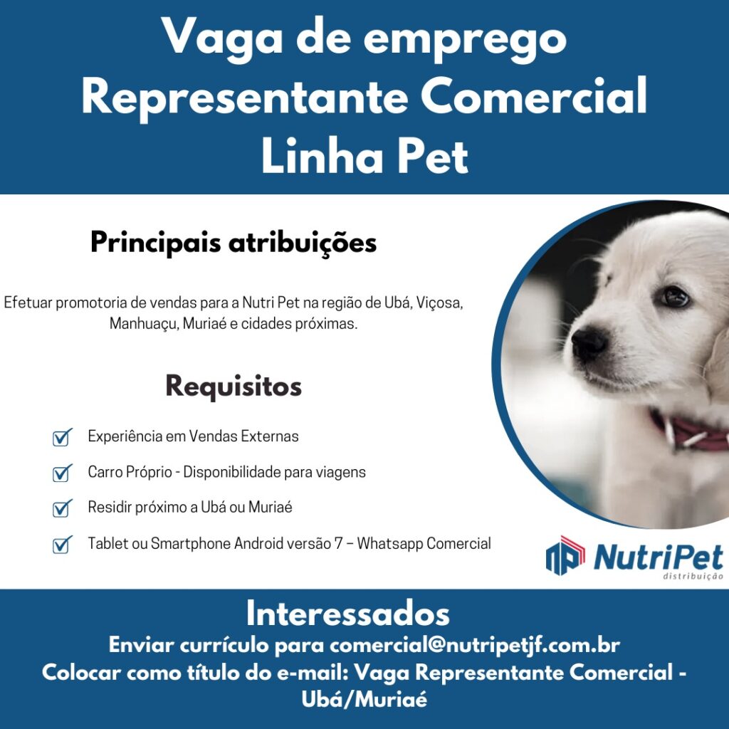 Os interessados devem enviar currículo para o endereço comercial@nutripetjf.com.br com o título do e-mail “Vaga Representante Comercial – Ubá Muriaé”.