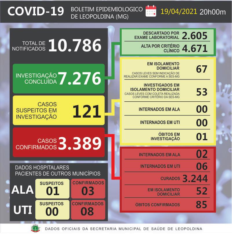 Leopoldina contabiliza agora, 3.389 casos do novo coronavírus, com 3.244 pessoas consideradas recuperadas.