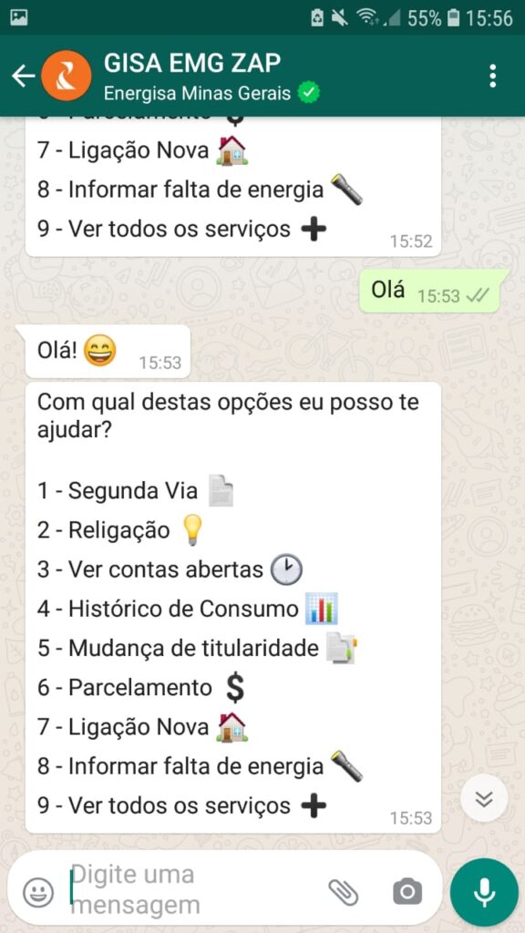 Simone Dornelas, coordenadora Comercial da Energisa, observa que o WhatsApp é um aplicativo popular no país e, provavelmente, por isso há a preferência pela ferramenta. “Lançado em agosto de 2019 pela Energisa em Minas Gerais, observamos que os clientes têm conseguido realizar os serviços pelo celular. A gente já faz muita coisa pelo Whats. Conversa com os amigos, encomenda produtos e até pede um lanche. Nada mais natural, que falar com a Energisa também pela ferramenta”, comenta. Dentre os serviços disponíveis, destacam-se a segunda via de fatura (90%), atualização cadastral (2%) e a religação de energia (2%). Pesquisa da Panorama Mobile Time/Opinion Box, divulgada em 2020, confirma que o aplicativo do WhatsApp está instalado em 99% dos smartphones dos brasileiros e 93% usam o aplicativo todo dia.