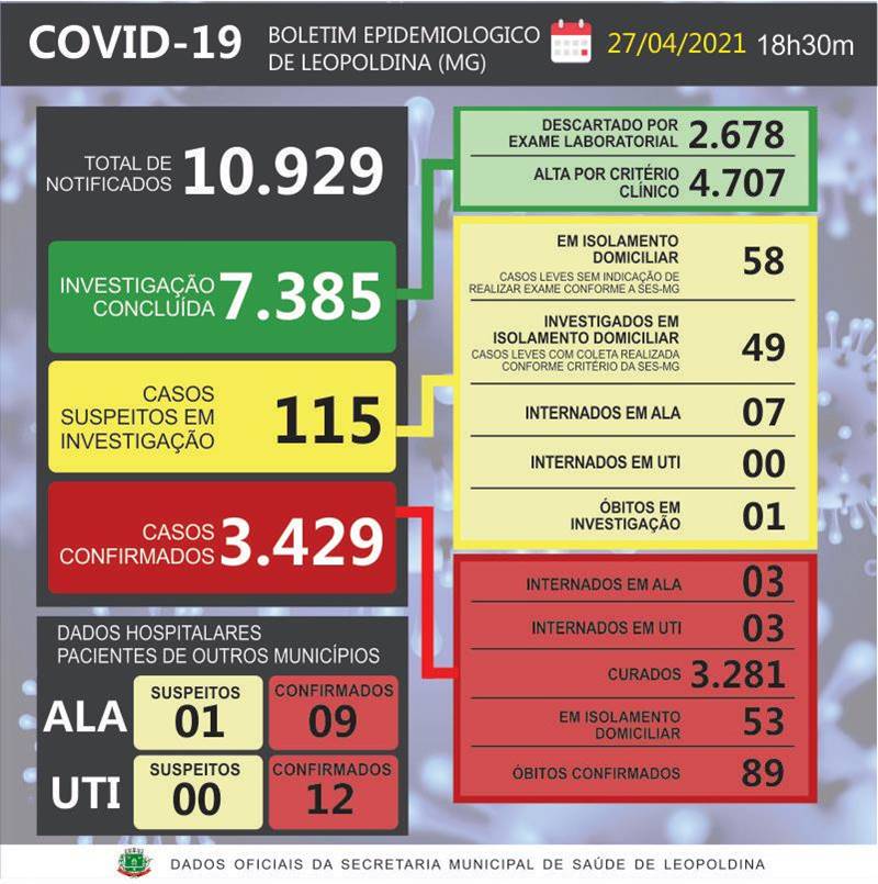 Ao todo, Leopoldina contabiliza 3.429 casos confirmados, com 53 pessoas em isolamento domiciliar monitorado.
