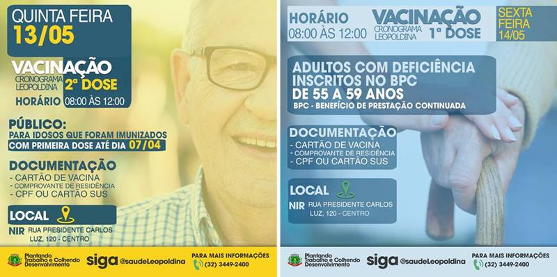 A prefeitura de Leopoldina informou que vai aplicar a segunda dose da vacina Coronavac para pessoas que tomaram a primeira dose do imunizante até 7 de abril.
