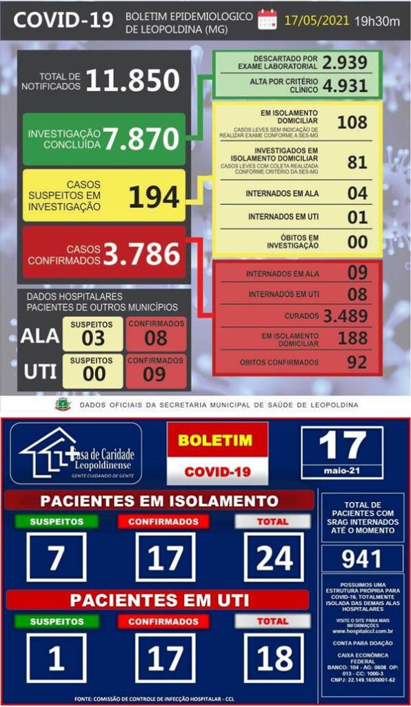 O boletim da Casa de Caridade Leopoldinense aponta que 42 pessoas se encontram internadas naquela instituição de saúde que é referência no tratamento da Covid-19 na região.