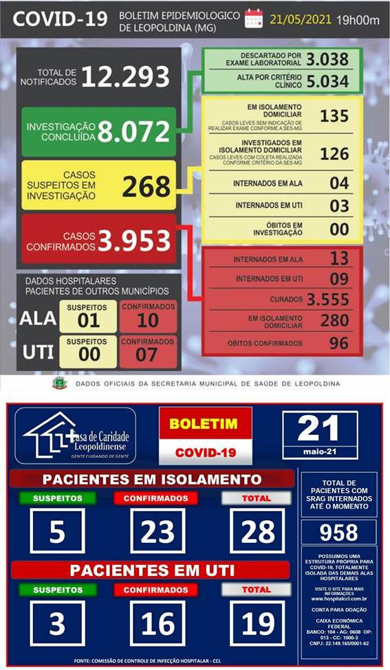 De acordo com os boletins da SMS e da Casa de Caridade Leopoldinense, 47 pessoas seguem internadas com a suspeita ou confirmação do novo coronavírus, 19 em terapia intensiva e 28 em enfermaria.