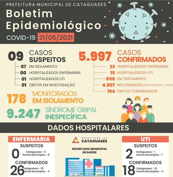 Desde o primeiro caso confirmado de Covid-19 em Cataguases até hoje são 5.997 registros sendo que ,desse montante, 194 vieram a óbito, 4.907 estão recuperados, 858 pacientes seguem em tratamento e 38 estão hospitalizados.