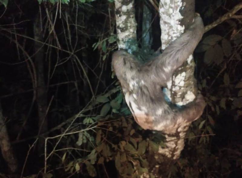 Um bicho-preguiça foi resgatado por militares do Corpo de Bombeiros na noite deste sábado, 22 de maio, às margens da BR-116, no Bairro São Luiz, em Leopoldina.