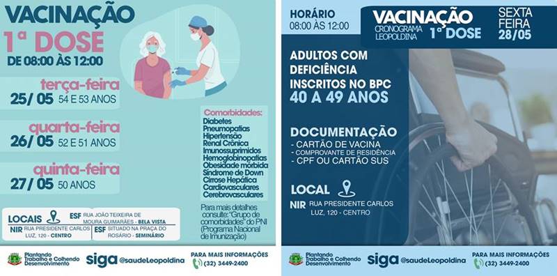 Leopoldina segue, a partir desta terça-feira, 25 de maio, vacinando contra a Covid-19 pessoas com deficiência e comorbidades.