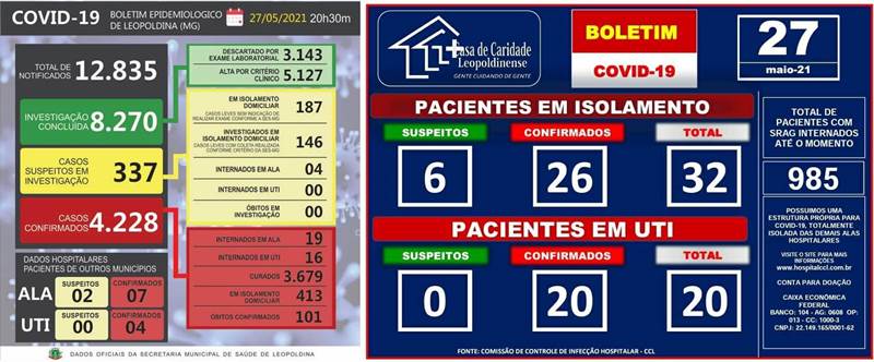De acordo com os boletins da SMS e da Casa de Caridade Leopoldinense, 52 pessoas seguem internadas com a suspeita ou confirmação de Covid-19, 20 em terapia intensiva e 32 em enfermaria.