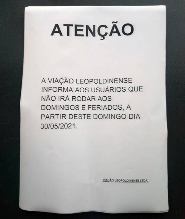 A Viação Leopoldinense, empresa concessionária do transporte coletivo de passageiros em Leopoldina, informou nesta quinta-feira, 27 de maio, que seus ônibus não circulariam domingos e feriados a partir desse domingo, dia 30 de maio.