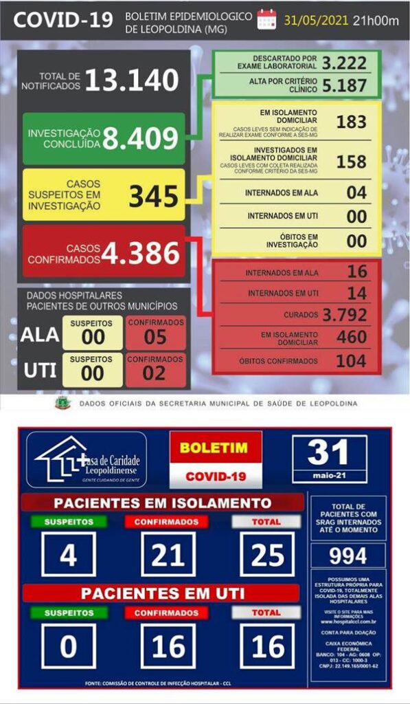 Conforme as informações do boletim diário divulgado pela Casa de Caridade Leopoldinense, 41 pacientes se encontram internados naquela instituição com confirmação ou suspeita de Covid-19. Ao todo, 16 pacientes internados em UTIs.