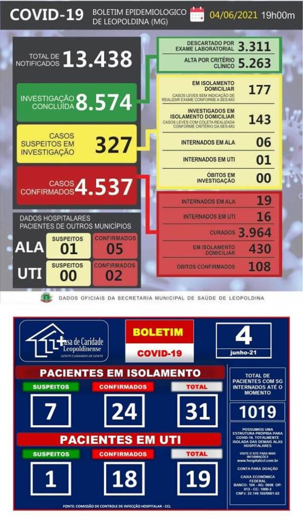 Ainda de acordo com o boletim, 50 pacientes se encontram internados na Casa de Caridade Leopoldinense com confirmação ou suspeita de Covid-19. Dezenove deles estão internados em terapia intensiva e 31 em enfermaria.
