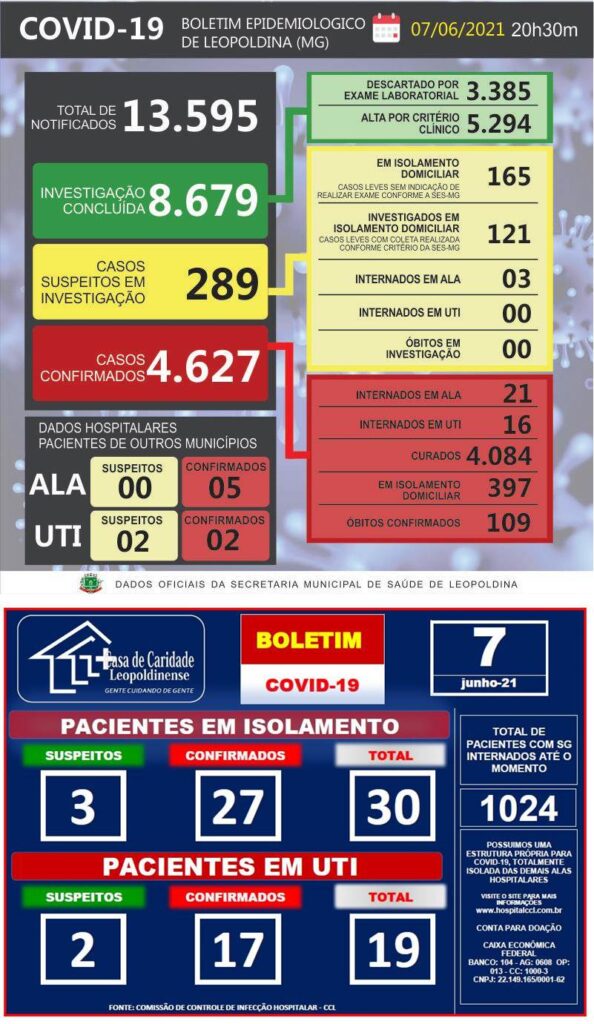 De acordo com os boletins da SMS e da Casa de Caridade Leopoldinense, 49 pessoas seguem internadas com a suspeita ou confirmação de Covid-19, 19 em terapia intensiva e 30em enfermaria.