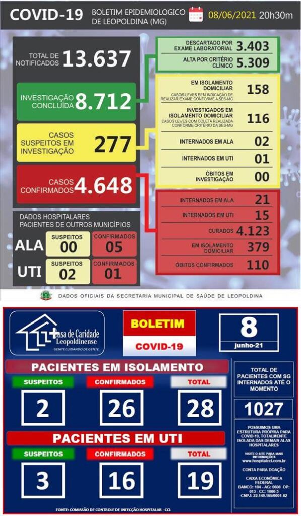 De acordo com o boletim da Casa de Caridade Leopoldinense, 16 moradores de Leopoldina seguem internados nos leitos de terapia intensiva exclusivos para pacientes com a suspeita ou confirmação do novo coronavírus, além de 3 moradores de cidades vizinhas.