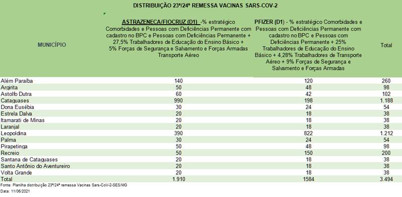 De acordo com a Gerência Regional de Saúde (GRS) de Leopoldina, foram recebidas 1.910 doses da AstraZeneca e 1.584 doses da Pfizer para continuação do esquema de vacinação dos grupos prioritários elencados pelo Ministério da Saúde, tais como: comorbidades e pessoas com deficiências permanente com cadastro no BPC, pessoas com deficiências permanente, trabalhadores de Educação do Ensino Básico, forças de Segurança e Salvamento e Forças Armadas, gestantes e puérperas com comorbidades e componentes dos grupos prioritários.