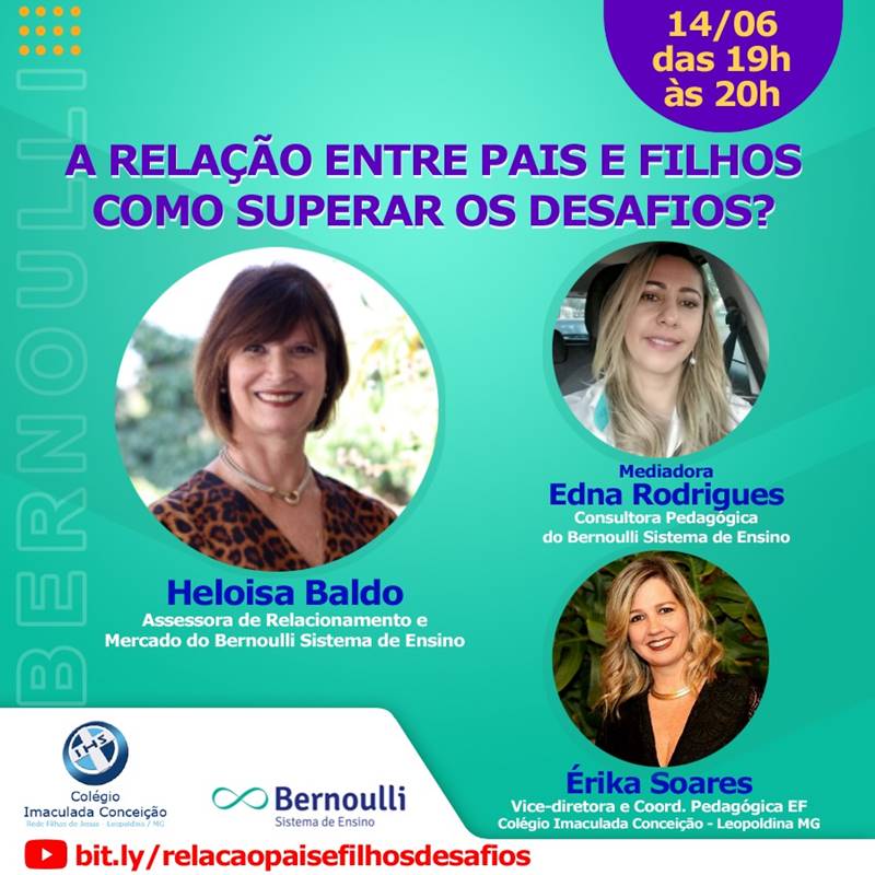 Nesta segunda-feira, dia 14 de junho, o Colégio Imaculada Conceição, Rede Filhas de Jesus, realiza em parceira com o Bernoulli Sistema de Ensino, às 19h00, a Live “A Relação entre Pais e Filhos: como superar os desafios”, evento que será transmitido pelo canal do YouTube do Colégio Imaculada.