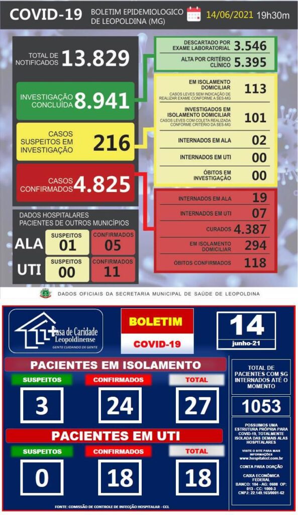 De acordo com os boletins da SMS e da Casa de Caridade Leopoldinense, 45 pessoas seguem internadas com a suspeita ou confirmação de Covid-19, 18 em terapia intensiva e 27 em enfermaria.
