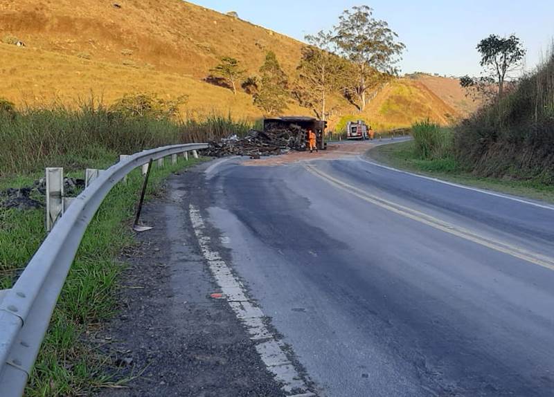 Uma carreta carregada de sucata tombou na altura do Km 75 da rodovia BR-267 nesta terça-feira (15) próximo ao município de Bicas.
