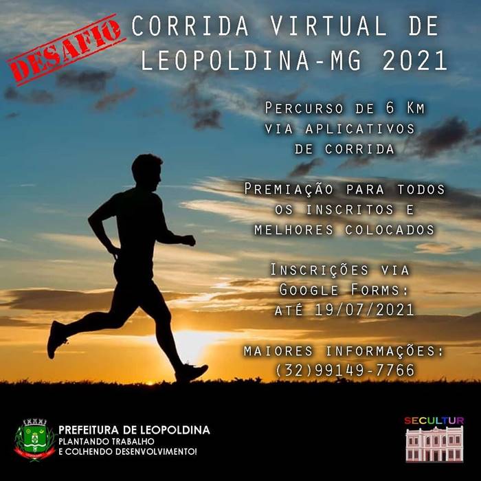 Para se inscrever no 1° Desafio Corrida Virtual de Leopoldina 2021 o interessado pode se inscrever clicando aqui até o dia 7 de julho. A prova de 6 km deverá ser percorrida de forma individual, mantendo protocolos de segurança sanitária, como uso de máscara e distanciamento social.
