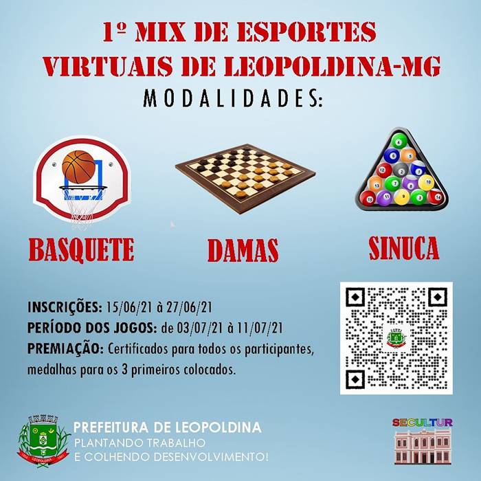 A Prefeitura Municipal de Leopoldina, através da Secretaria Municipal de Esportes, Lazer, Cultura e Turismo (SECULTUR) promove o 1° Mix de Esportes Virtuais de Leopoldina com as modalidades de basquete, damas e sinuca e o 1° Desafio Corrida Virtual de Leopoldina 2021.