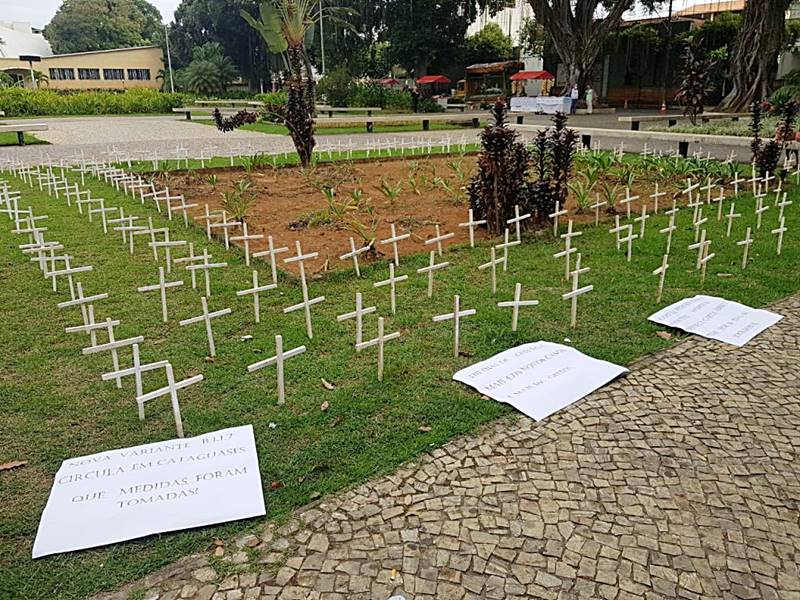 A Praça Santa Rita, em Cataguases, amanheceu neste sábado, 19 de junho, com 246 cruzes fincadas em um de seus canteiros.