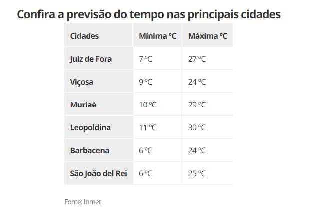 A queda nos termômetros será mais percebida em Barbacena e São João del Rei, que registram 6 ºC de mínima. De acordo com Claudemir de Azevedo, a sensação térmica deve chegar aos 2 ºC em Barbacena.