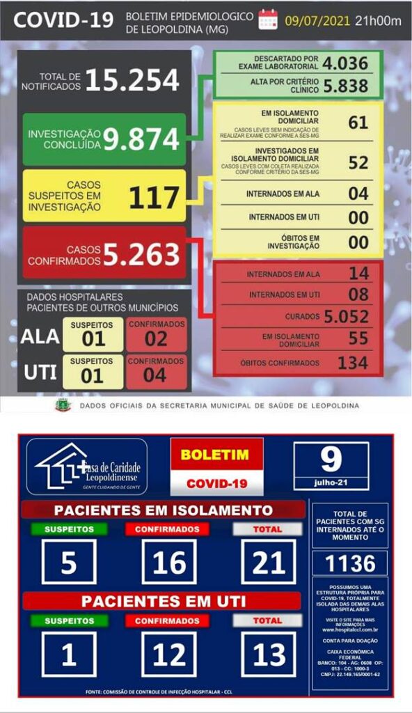 De acordo com o boletim diário divulgado pela Casa de Caridade Leopoldinense, 34 pacientes se encontram internados naquela instituição com confirmação ou suspeita de Covid-19. Ao todo, 13 pacientes internados em UTIs.