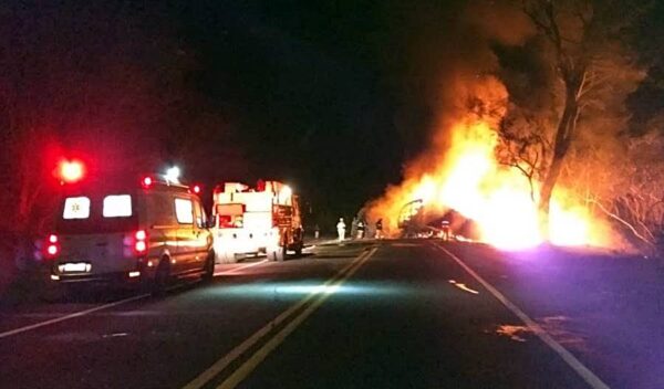 Trânsito é liberado em meia pista na BR-116 em Leopoldina após colisão entre duas carretas