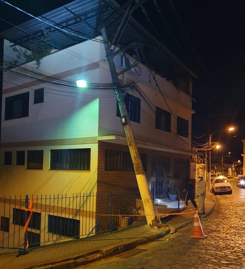 Um poste localizado no bairro Alto do Cemitério, em Leopoldina, ficou pendurado pela fiação, após ser atingido por uma carreta na noite desta sexta-feira, 23 de julho. Apesar do susto, ninguém se feriu.