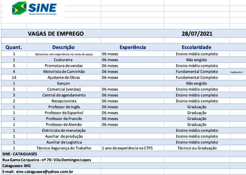 O Sine está divulgando nesta quinta-feira, 29 de julho, nova relação de vagas que estarão disponíveis aos interessados até serem preenchidas.