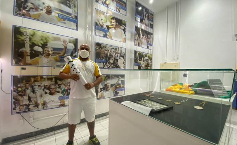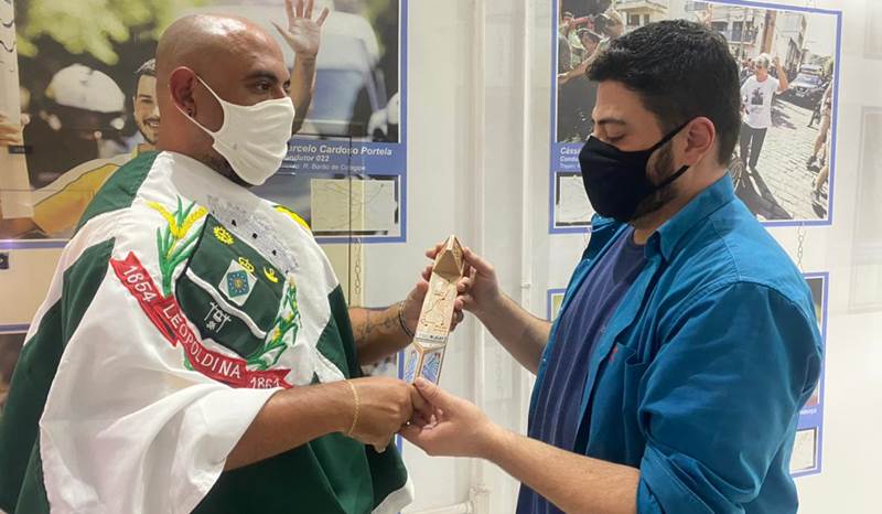 Diego trouxe de volta a Tocha Olímpica e entregou para o Secretário de Esportes, Lazer, Cultura e Turismo, Victor Guilherme (foto abaixo), a Relíquia do 5° Encontro Nacional dos Condutores da Tocha Olímpica de Ouro Branco, que já se encontra em exposição no Memorial do Esporte Leopoldinense, no Centro Cultural Mauro de Almeida.