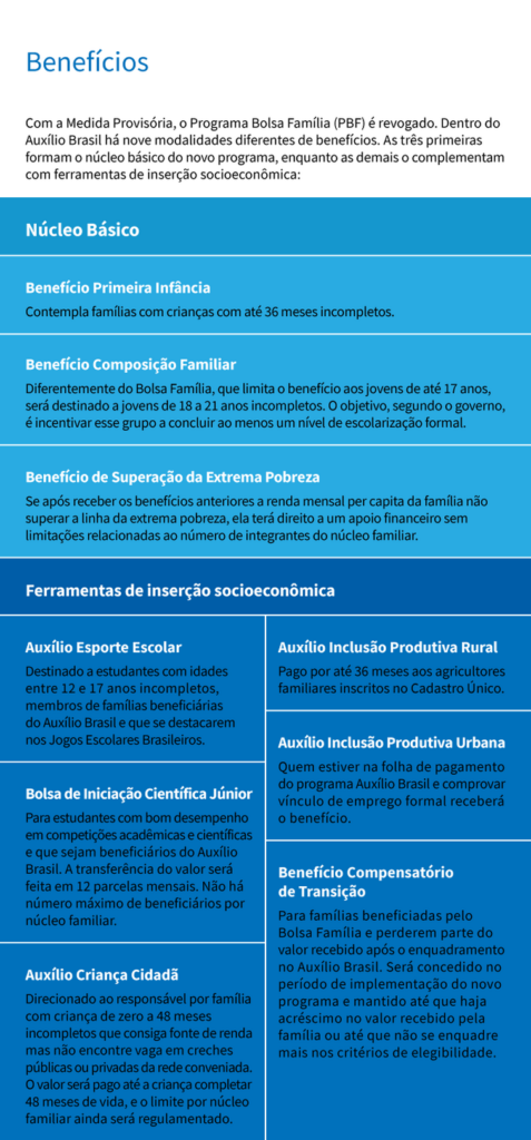 Chamado de Auxílio Brasil, o novo programa social que pretende substituir o Bolsa Família tem três modalidades de benefício básico: para primeira infância, para famílias com jovens de até 21 anos de idade e para a complementação para famílias que não conseguirem sair da extrema pobreza mesmo após receber os benefícios anteriores. Os valores só serão definidos no fim de setembro.