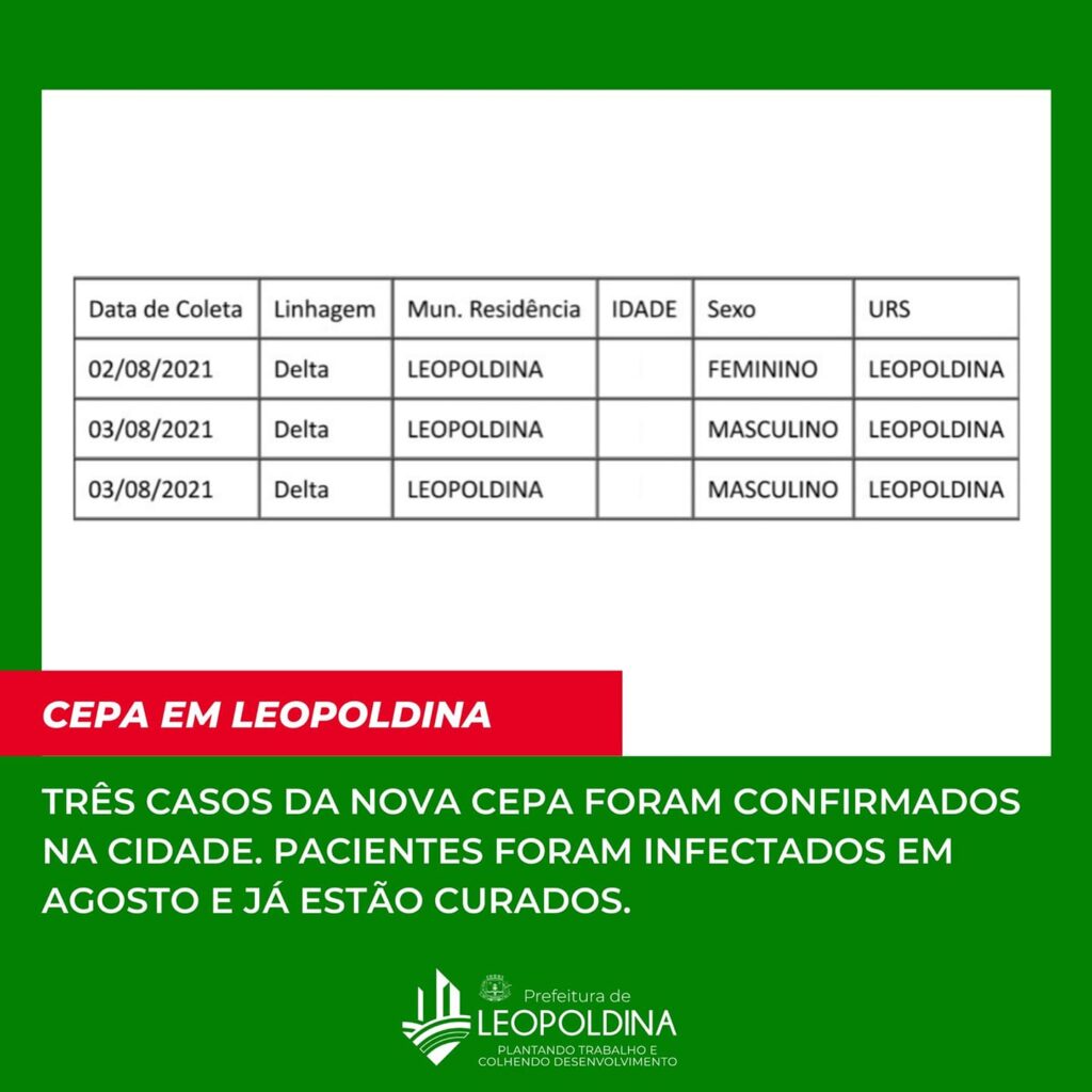A Prefeitura de Leopoldina confirmou, nesta quinta-feira (2), três contaminações pela Covid-19 com a variante delta.