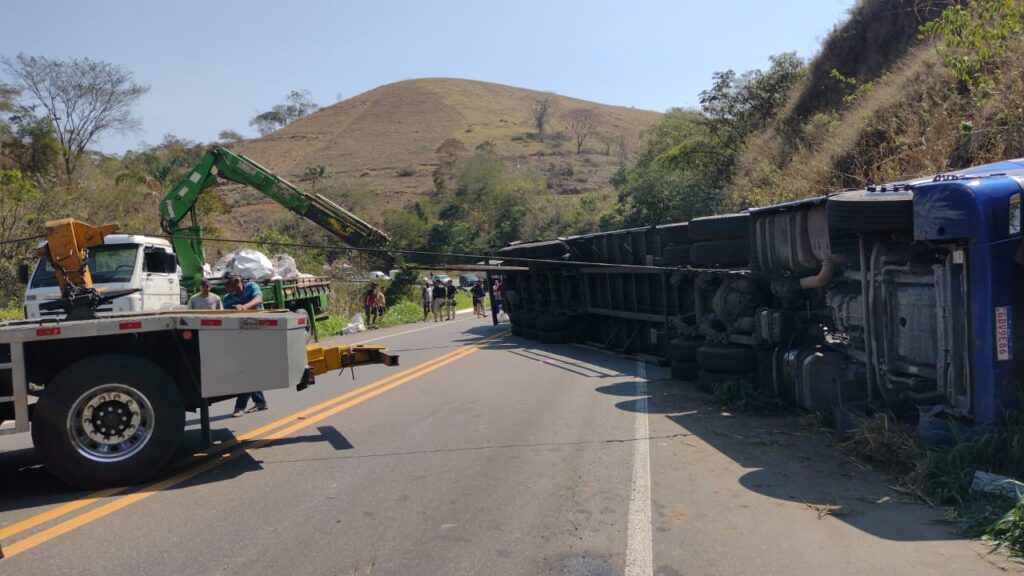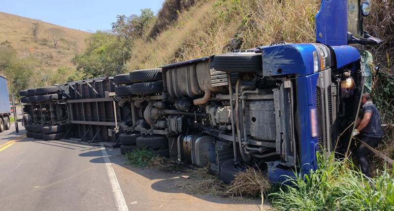 Carreta com carga de produtos de limpeza tomba e fere motorista na BR-116 em Leopoldina