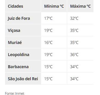 Na sexta-feira (17) e sábado (18), o céu fica nublado e com possibilidade de chuvas nas cidades da Zona da Mata. Já no Campo das Vertentes, as condições são de céu parcialmente nublado e sem precipitação.