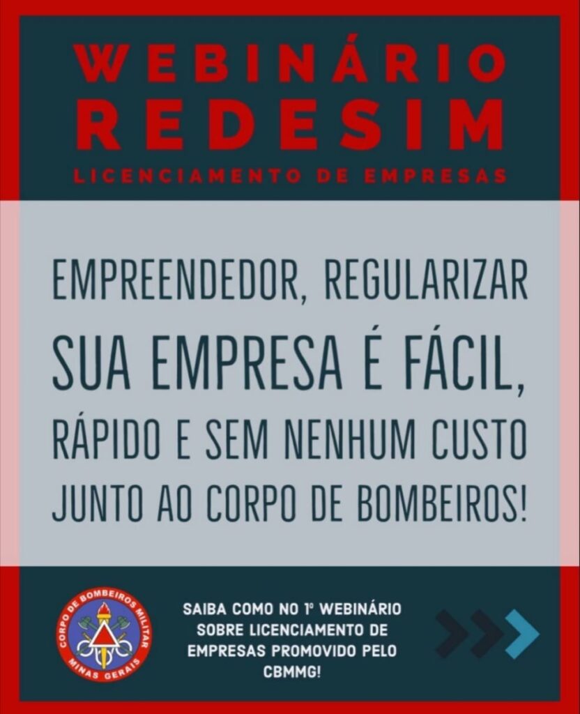 O Corpo de Bombeiros Militar de Mina Gerais promove nesta terça-feira, 21 de setembro, o 1º Webinário sobre a REDESIM. O evento acontece de forma online e gratuita e o interessado deve se inscrever clicando no link abaixo.