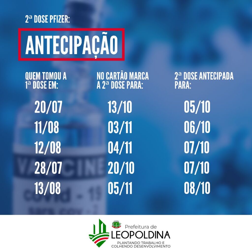 A Secretaria Municipal da Saúde de Leopoldina inicia nesta terça-feira, 5 de outubro, a nova antecipação de segunda dose de Pfizer para quem precisa completar o esquema vacinal contra a Covid-19.