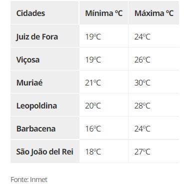 No que se refere às temperaturas, a mínima no Campo das Vertentes será de 16ºC e a máxima 27ºC. Já na Zona da Mata, a temperatura mínima prevista é de 17ºC e máxima 30ºC.