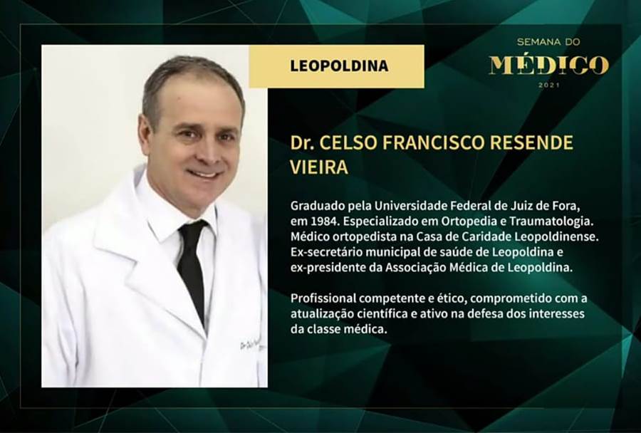 Um dos agraciados com a homenagem “Médico Mineiro em Destaque” foi o médico Dr. Celso Francisco Resende Vieira, de Leopoldina. Graduado pela Universidade Federal de Juiz de Fora em 1984, especializado em Ortopedia e Traumatologia, médico ortopedista na Casa de Caridade Leopoldinense, ex-secretário municipal de Saúde de Leopoldina e ex-presidente da Associação Médica de Leopoldina de 2017 a 2020, quando assumiu a presidência da AML o médico Dr. Paulo Rubens.