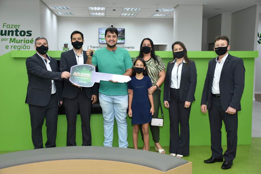 Daniel é associado da agência Muriaé Barra e estava participando da Promoção desde que ela teve início, no mês de fevereiro. Ele recebeu as chaves do automóvel Gol das mãos da Gerente Regional de Desenvolvimento, Cátia da Silveira Fernandes e do Gerente de Desenvolvimento e Negócios, Laoni da Cunha. Também participaram do momento os gerentes das agências Muriaé Barra, Eduardo Gonçalves e da agência Muriaé Centro, Jefferson da Costa.