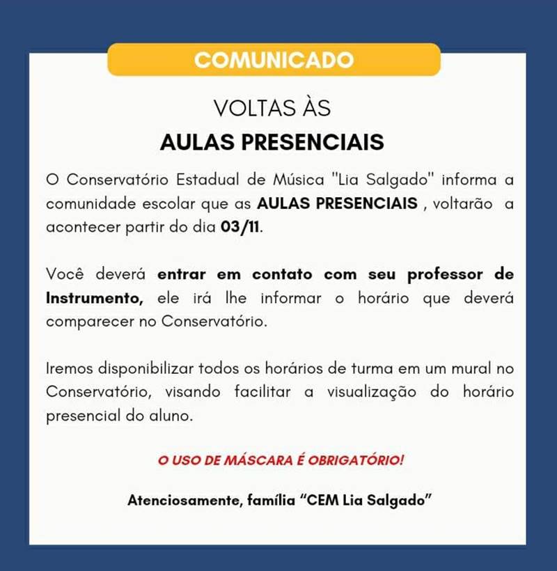 O Conservatório Estadual de Música Lisa Salgado, em Leopoldina, inicia na próxima quarta-feira, 3 de novembro, a retomada das aulas e atividades presenciais.
