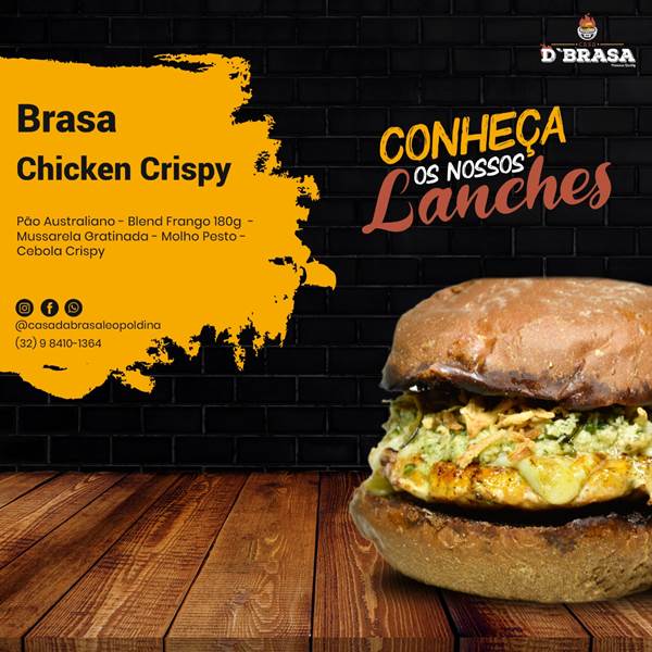 Conheça o Brasa Chicken Crispy: Pão Australiano – Blend Frango 180g – Mussarela Gratinada – Molho Pesto – Cebola Crispy.